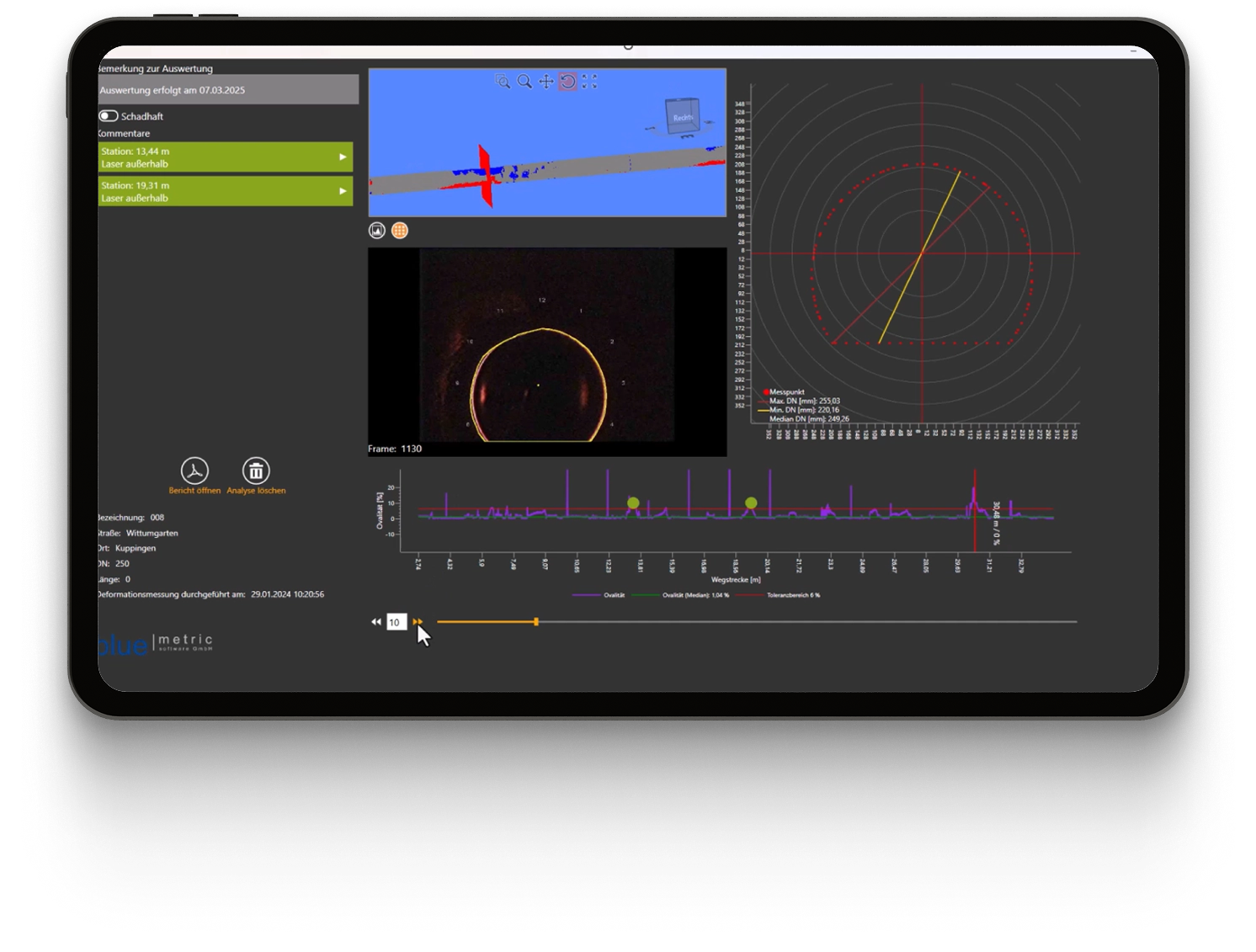 Laserbasierte Messung von Ovalität und Profilveränderungen im Rohr. Ergebnisse werden grafisch, tabellarisch und im Bericht ausgegeben. Auffälligkeiten sind klar erkennbar und können projektübergreifend ausgewertet werden.
